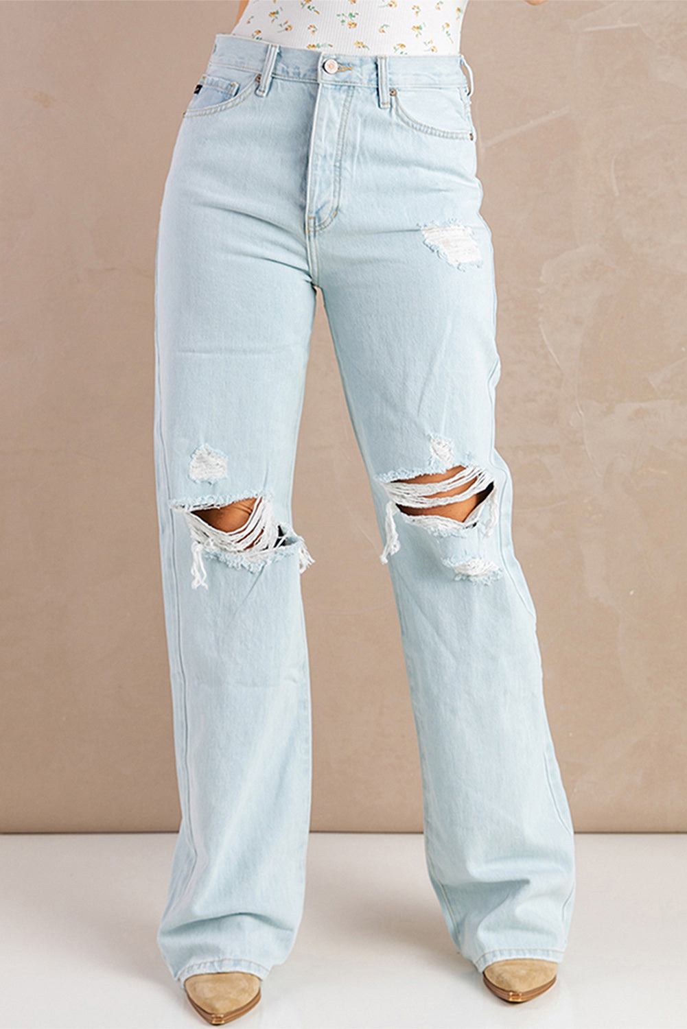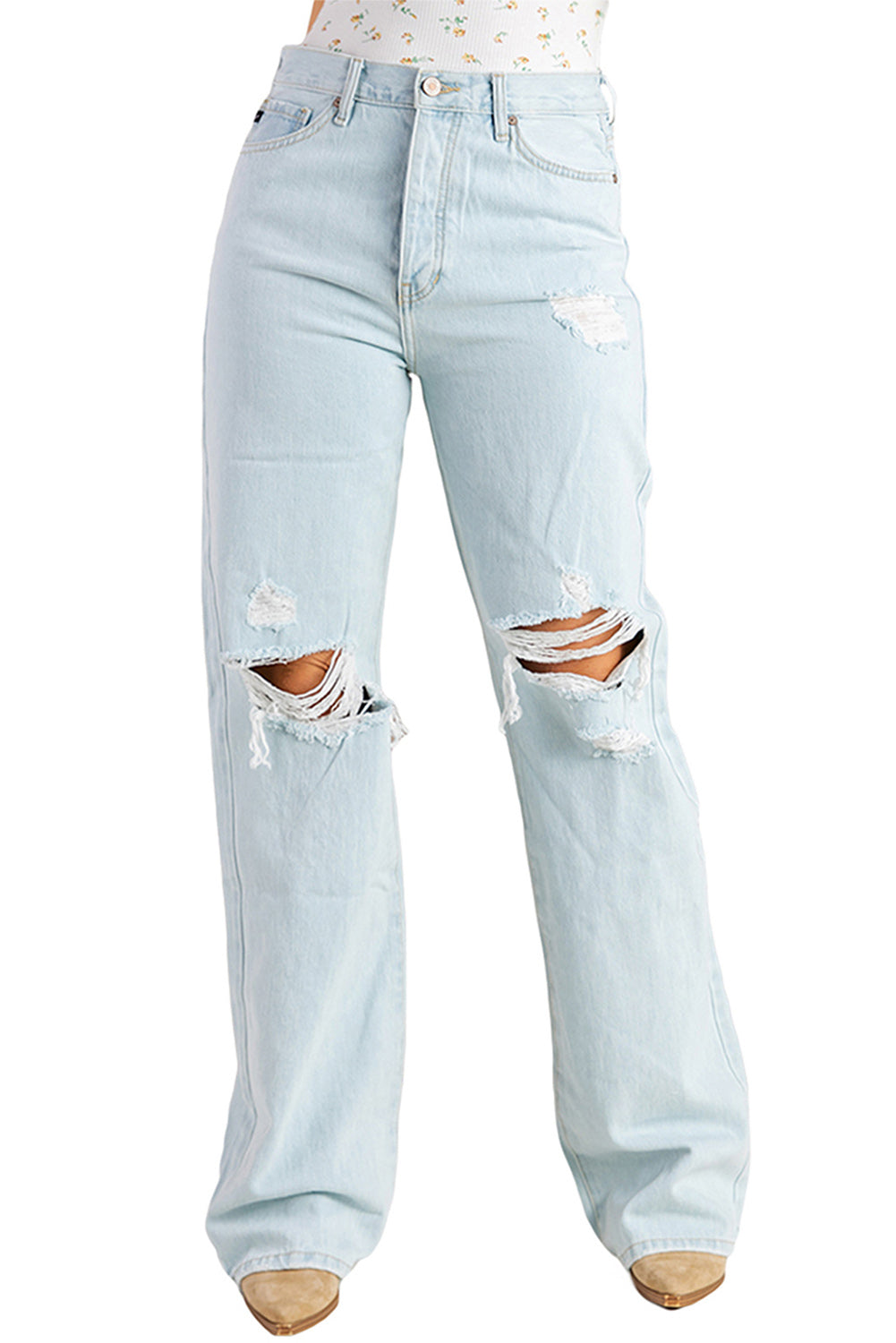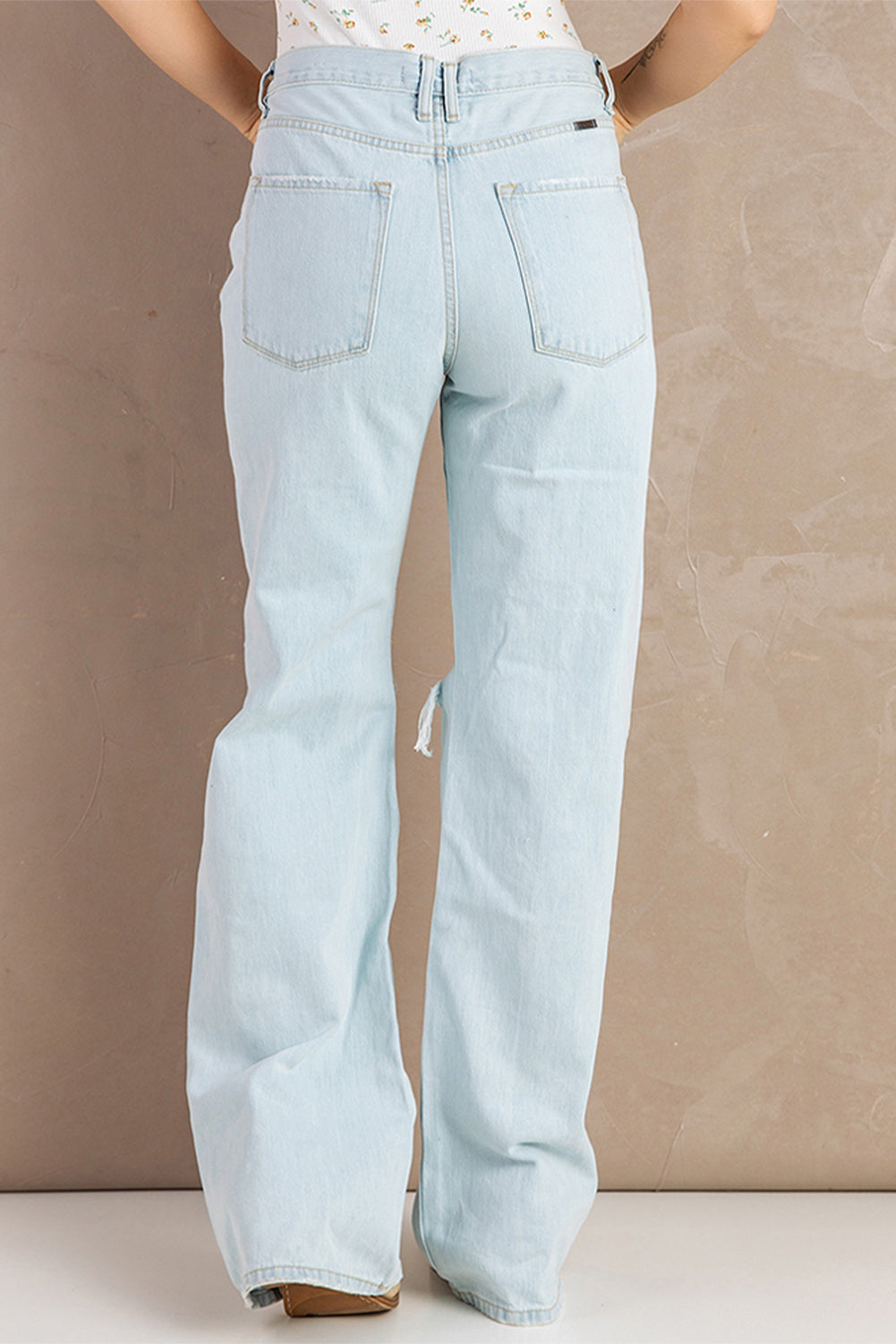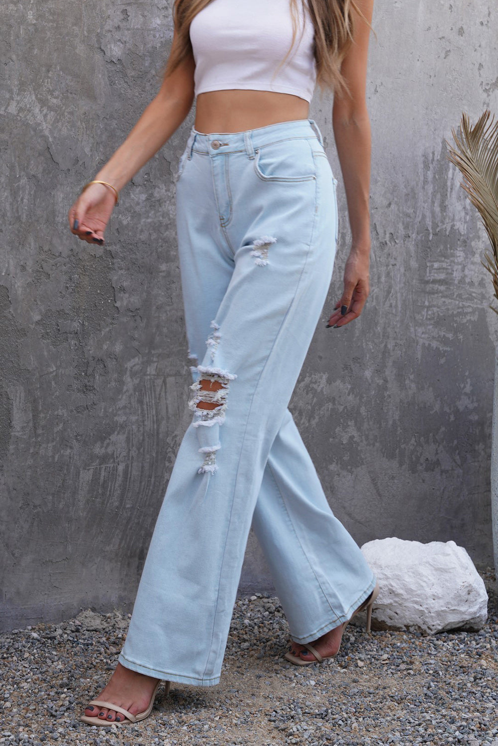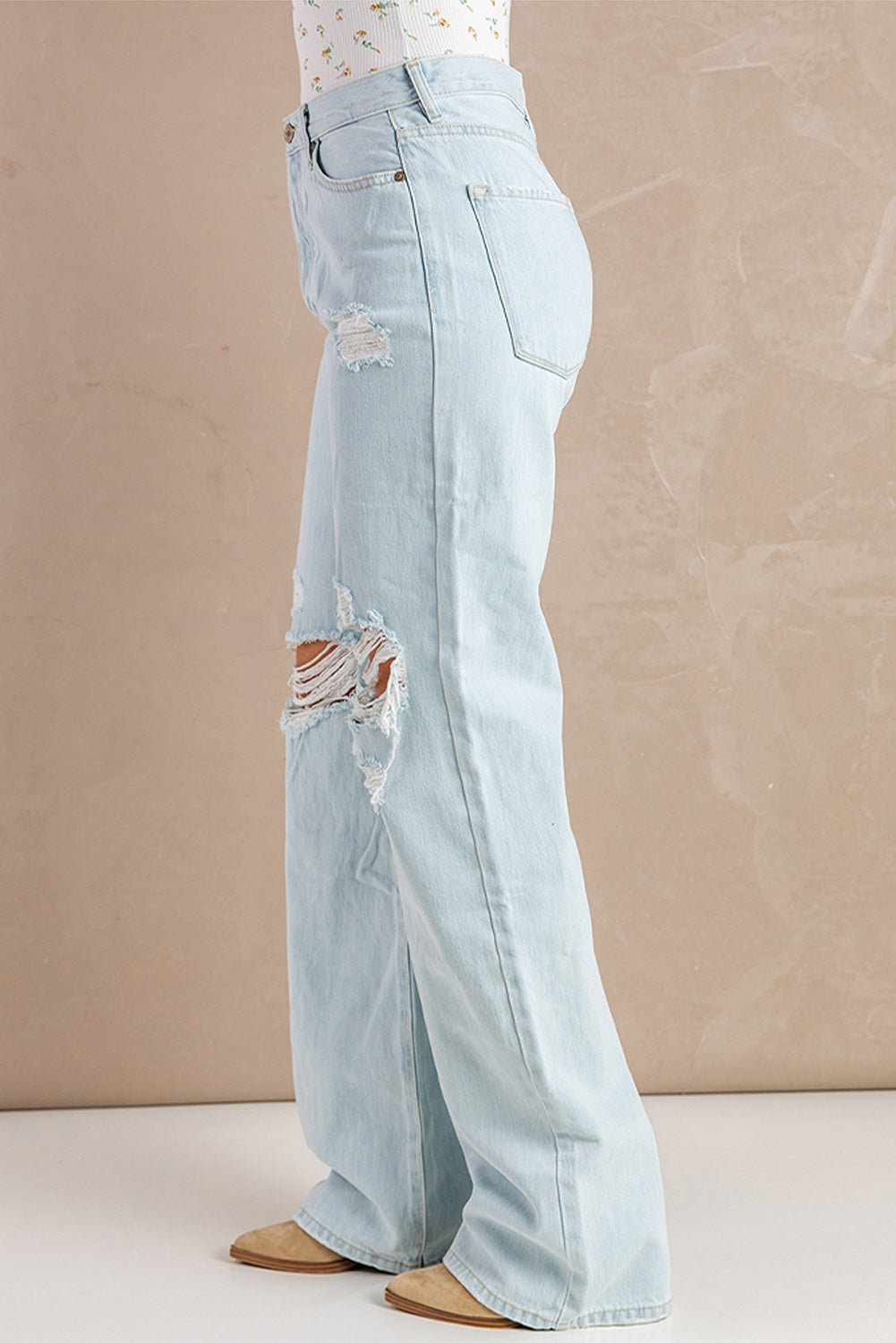 Sky Blue Washed Ripped Knee Wide Legs Jeans